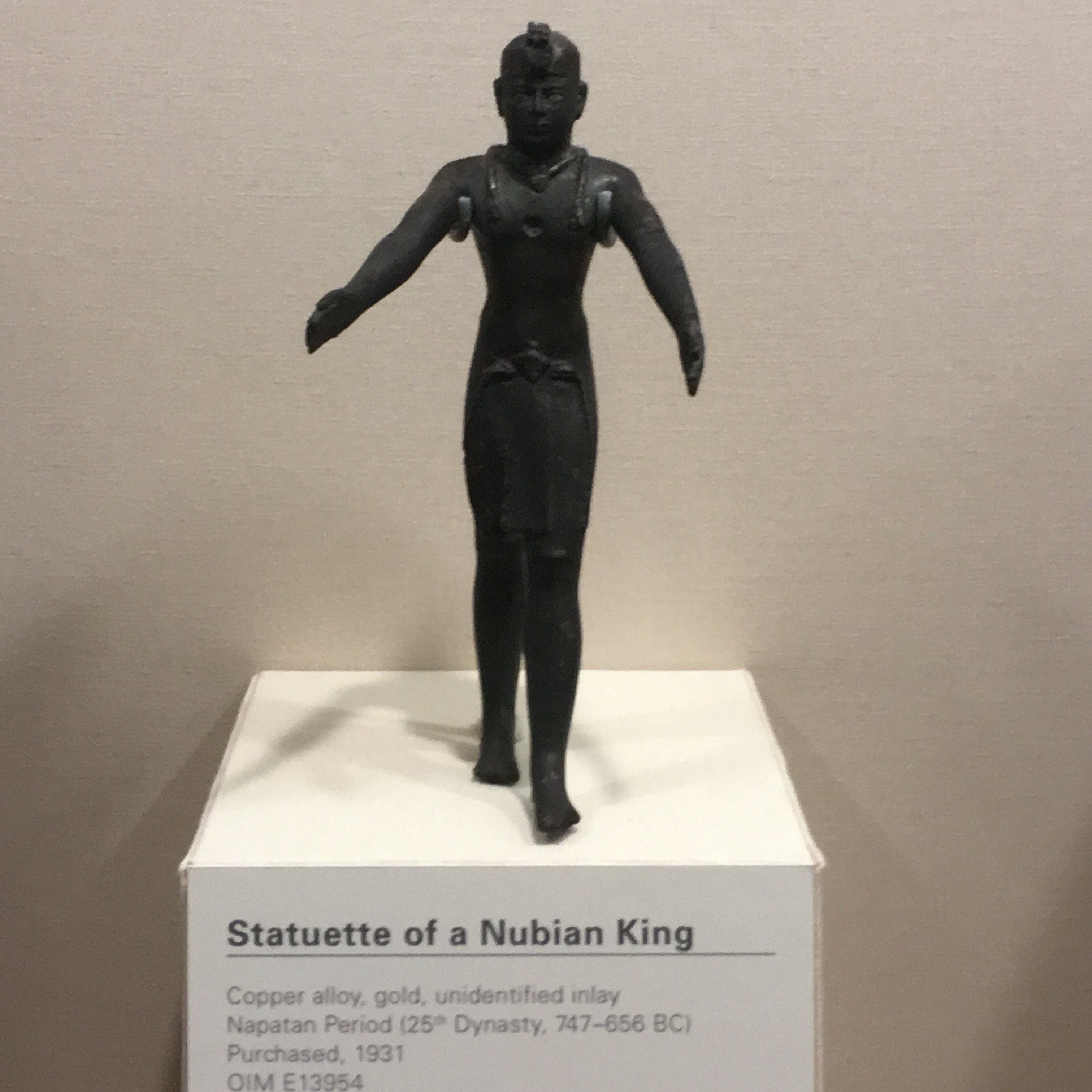 One of the most rewarding tasks was to work with Barbara on a new metals storage room, helping to gather materials squirreled away throughout the Museum basement for rehousing. While engaged in this task, I came across an old, cardboard shoebox with ‘forgery’ penciled on the lid. To my amazement when I opened the box, I saw not a fake, but a bronze sculpture of a Nubian pharaoh of the Twenty-Fifth Dynasty (ca. 722–ca. 655 BCE). The figure’s non-Egyptian regalia (the cap crown, double uraeus, and pendant ram heads), combined with its physiognomy (its broad features as well as stocky musculature), and the somewhat ‘Frankenstein-ish’ pose of the piece must have appeared dubious to someone not familiar with Kushite art. However, this statuette clearly fits into the typology of small bronze statuettes of these kings. I had also been interning in the Department of Egyptian Art at the Boston Museum of Fine Arts while Edna (Ann) Russmann was there, the preeminent scholar on the subject, and became familiar with her catalogue of the royal sculpture of the Nubian Dynasty. However, since the statuette had been dismissed as a fake and hidden away in its shoebox it had never made it into the compendium.