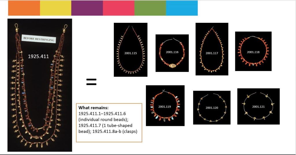 It was decided to keep some of the Marrs necklaces as they had originally been purchased as examples of the original manner in which they were sold. Another unique aspect of the collection is that it retained information on the original sellers, Mohamed Mohassib and Sons, a famous Luxor antiquities dealer that included the price along with the provenance of some of the items.