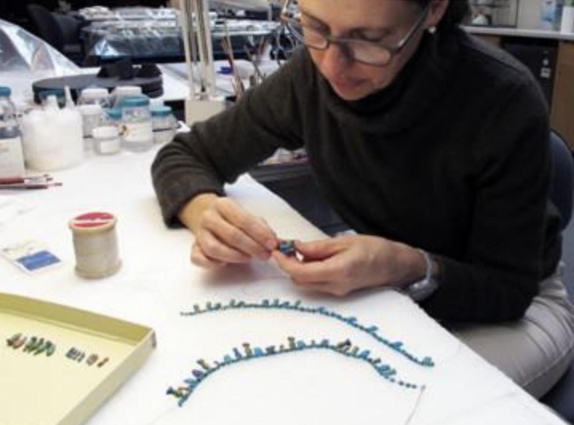 Much of the jewelry in the Marrs collection had been restrung in the fashion of the day. As part of the loan to the Carlos, it was decided to dissemble a number of the necklaces that were a pastiche of pieces that belonged to different periods and compositions and to restring them correctly on the basis of excavated examples. After the Marrs pieces were fully documented in notes and photographs, they were carefully taken apart by the Worcester Art Museums conservation staff and re-strung with the advice of Shelia Shear, an expert on ancient Egyptian beadwork.